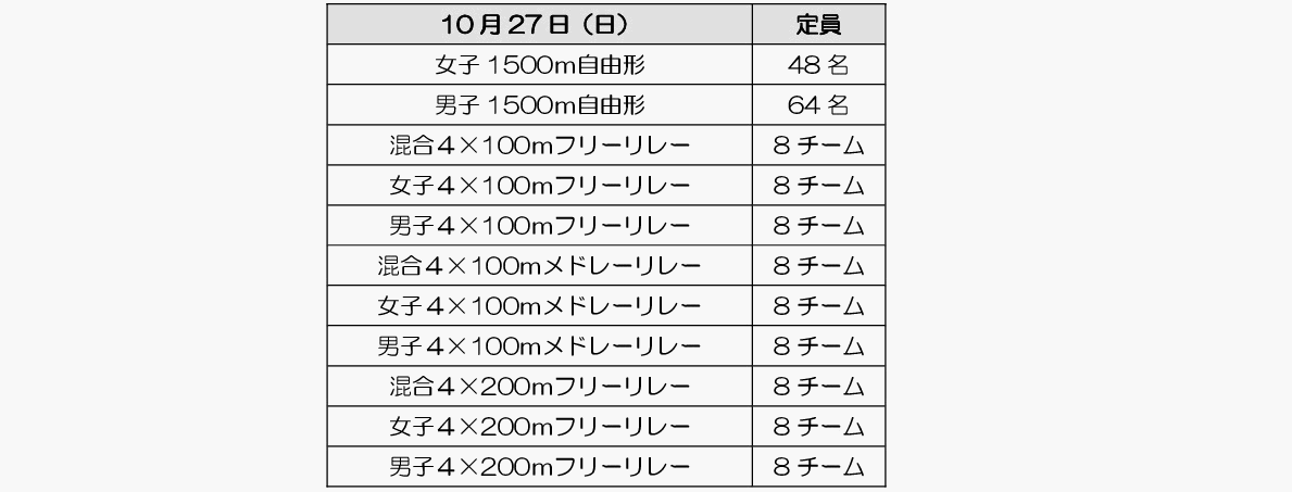 愛知会場のみの開催となります。800m自由形、400m個人メドレーは行いません。