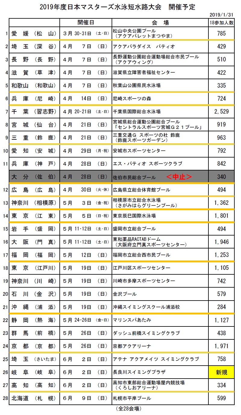 日本マスターズ水泳協会 2019年主催行事日程